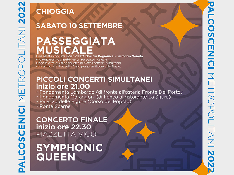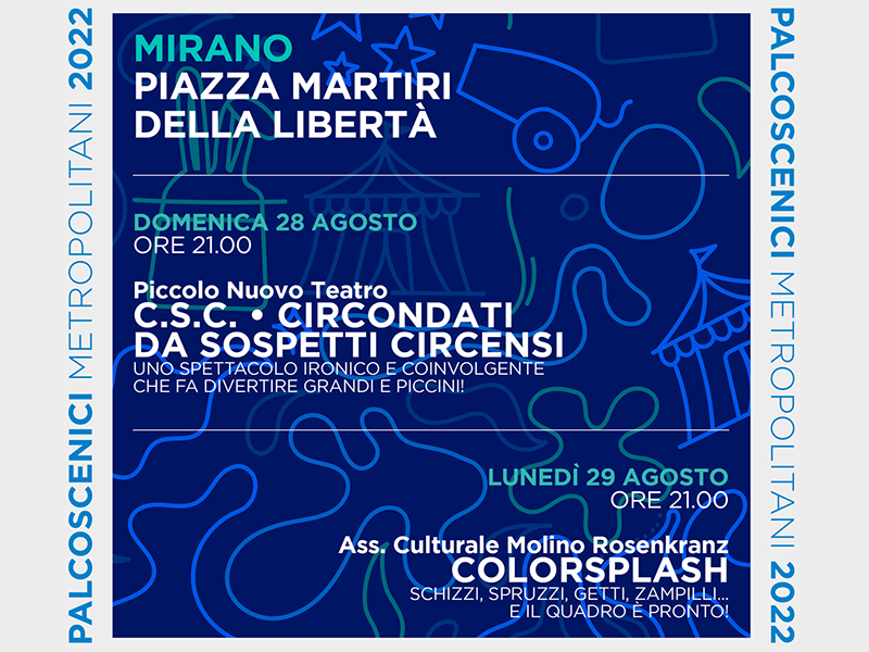 Al via Palcoscenici Metropolitani 2022, un ricchissimo programma di spettacoli dal vivo nella Città Metropolitana di Venezia tra luglio e dicembre 2022, organizzata dal Settore Cultura del Comune di Venezia in collaborazione con Arteven, Teatro Stabile del Veneto e Teatro la Fenice di Venezia