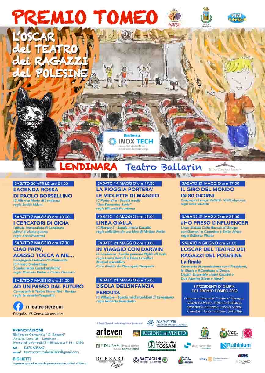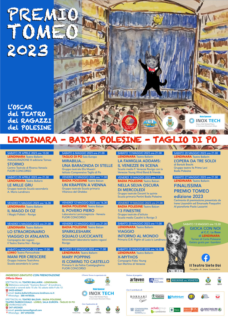 Il Premio Tomeo 2024 è ancora una volta un grande atto d’amore per il teatro e per la sua valenza formativa verso le nuove generazioni, da parte dell’associazione del terzo settore ViviRovigo e del Comune di Lendinara, che hanno unito sforzi e risorse in questo nuovo percorso artistico-culturale offerto ai ragazzi polesani. La direzione artistica è nuovamente affidata ad Irene Lissandrin che ha coinvolto in partnership i Comuni di Badia Polesine, Loreo e Taglio di Po, nel mettere a disposizione i loro teatri agli spettacoli iscritti a concorso.