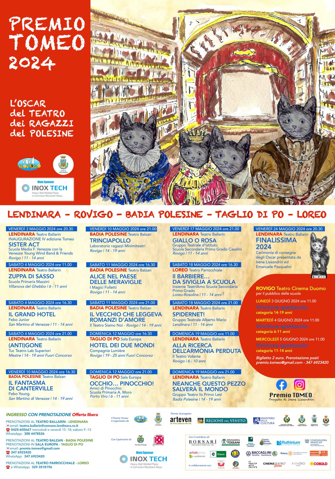 In palio, come sempre, le ormai iconiche statuette del Gatto Tomeo, personaggio letterario ideato da Alberto Cristini, e riconoscimenti in denaro di 500 euro, per i primi classificati nelle tre categorie: 6-11 anni, 11-14 anni, 14-19 anni. Sono poi previsti i Tomeo alla regia, al miglior testo originale, al miglior adattamento drammaturgico, all’originalità, al miglior linguaggio del corpo, alla scenografia, trucco e parrucco, al progetto sonoro dal vivo, al miglior gruppo teatrale, alla migliore attrice e miglior attore (solo nella fascia 14-19 anni) ed il premio della critica. Menzione speciale, con buoni acquisto da 300 euro, per i due spettacoli giudicati di speciale valore civico per il contrasto alla violenza o per la tematica ambientale. Gli spettacoli vincitori andranno poi in scena in una speciale mini-rassegna a loro dedicata, per il pubblico scolastico, dal 3 al 5 giugno 2024 al Teatro Duomo di Rovigo.